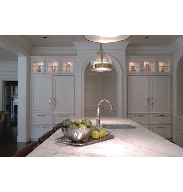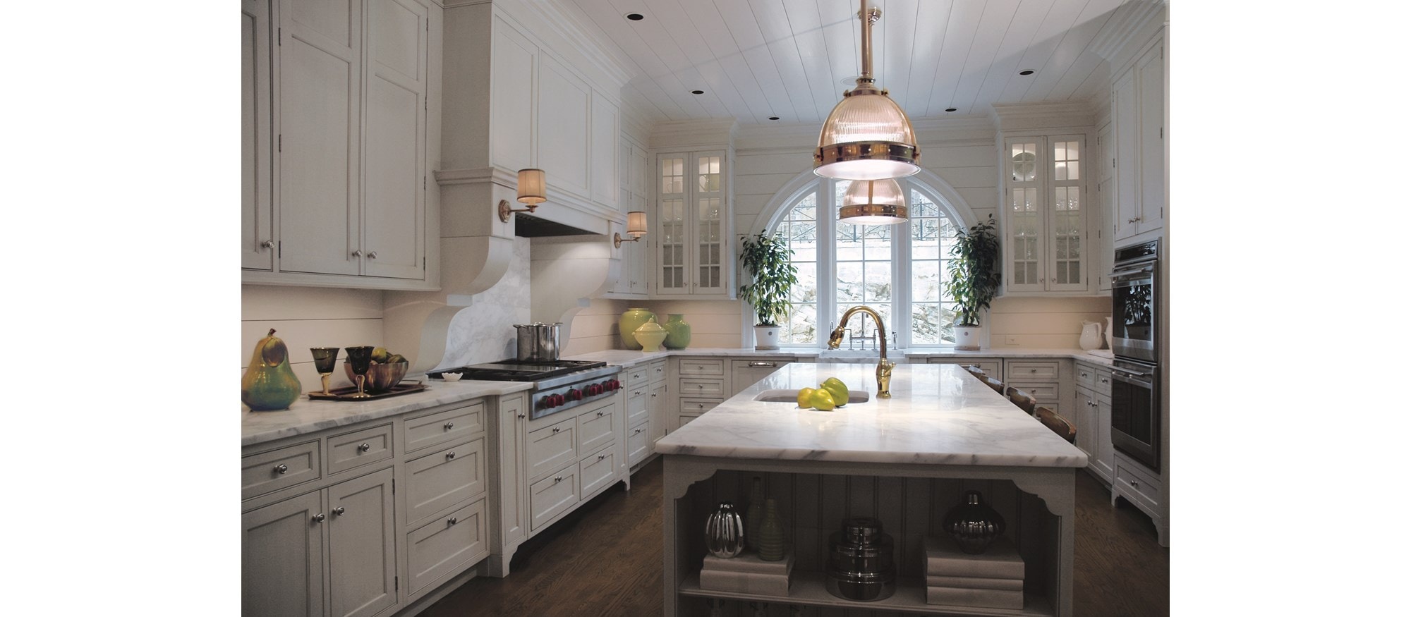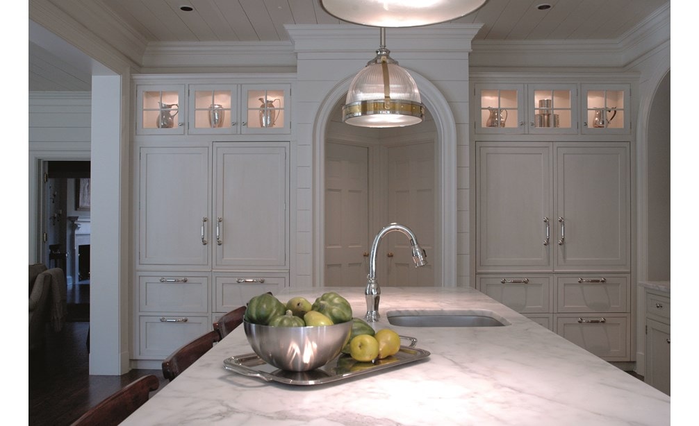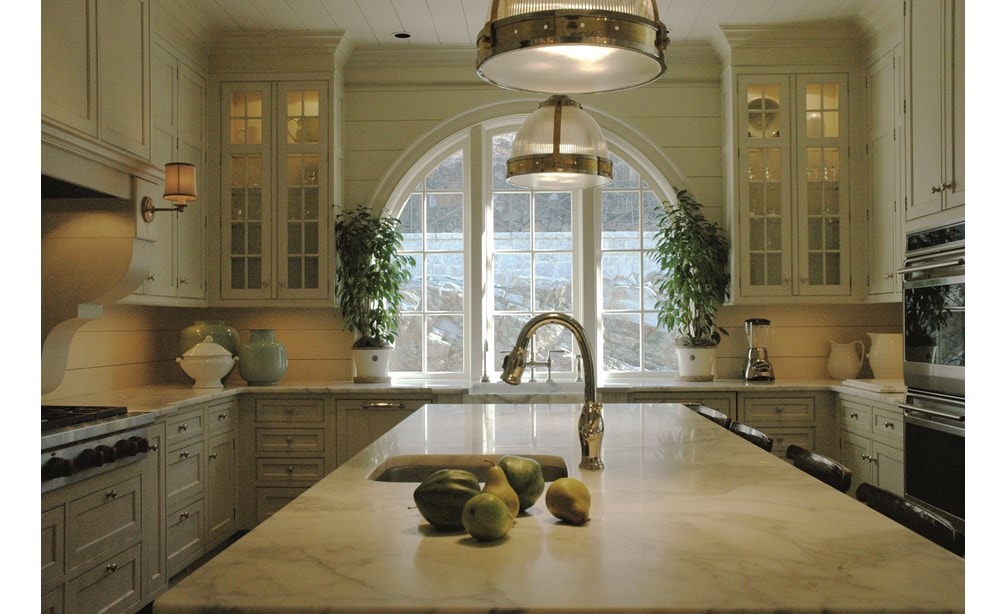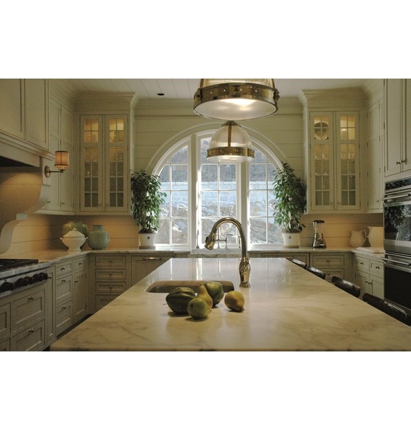 the design process is to find a clear and defined centerline," she explains. "In this kitchen the centerline is driven by the beautiful arched window that's also reflected by an arched pantry doorway. Once the centerline is defined, balance can be created. Centering the kitchen island on these strengthened the centerline even further. Together these balanced elements create a comfortable space, both visually and functionally.