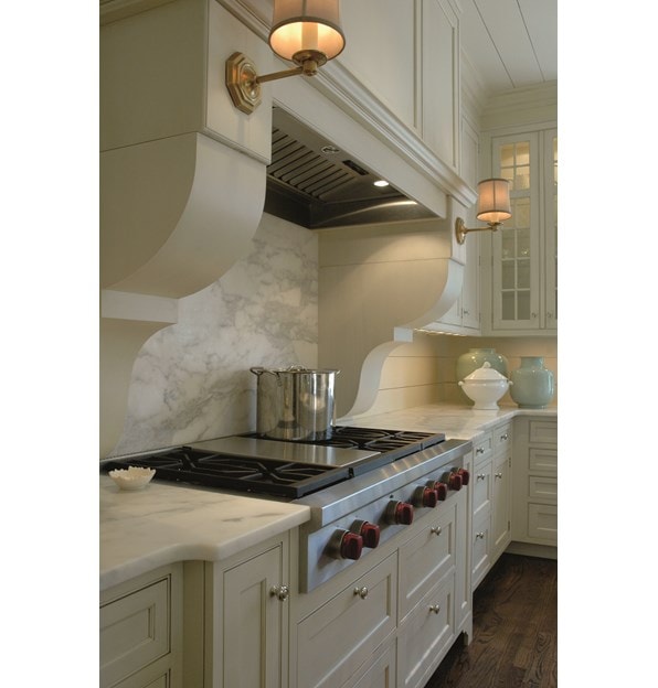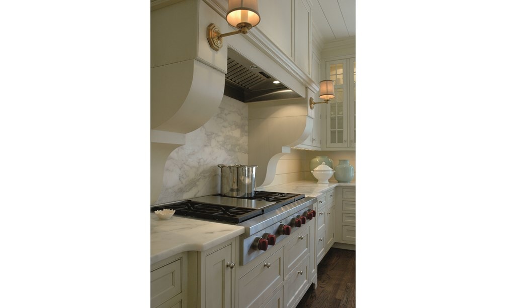 Cohesion with the garage entry, breakfast area and sitting room was achieved by pulling white paneling through the entire space including the three Sub-Zero refrigerators. "They look like tall, built-in armoires," says Pittman, who arranged a microwave and dish pantry behind a retractable door to mirror the Sub-Zeros for a pleasing symmetry. Pittman says that while the unique corbelled range hood and large pendant lights definitely add to the grandeur of the space, that symmetry was really the key. "For me, the first step in