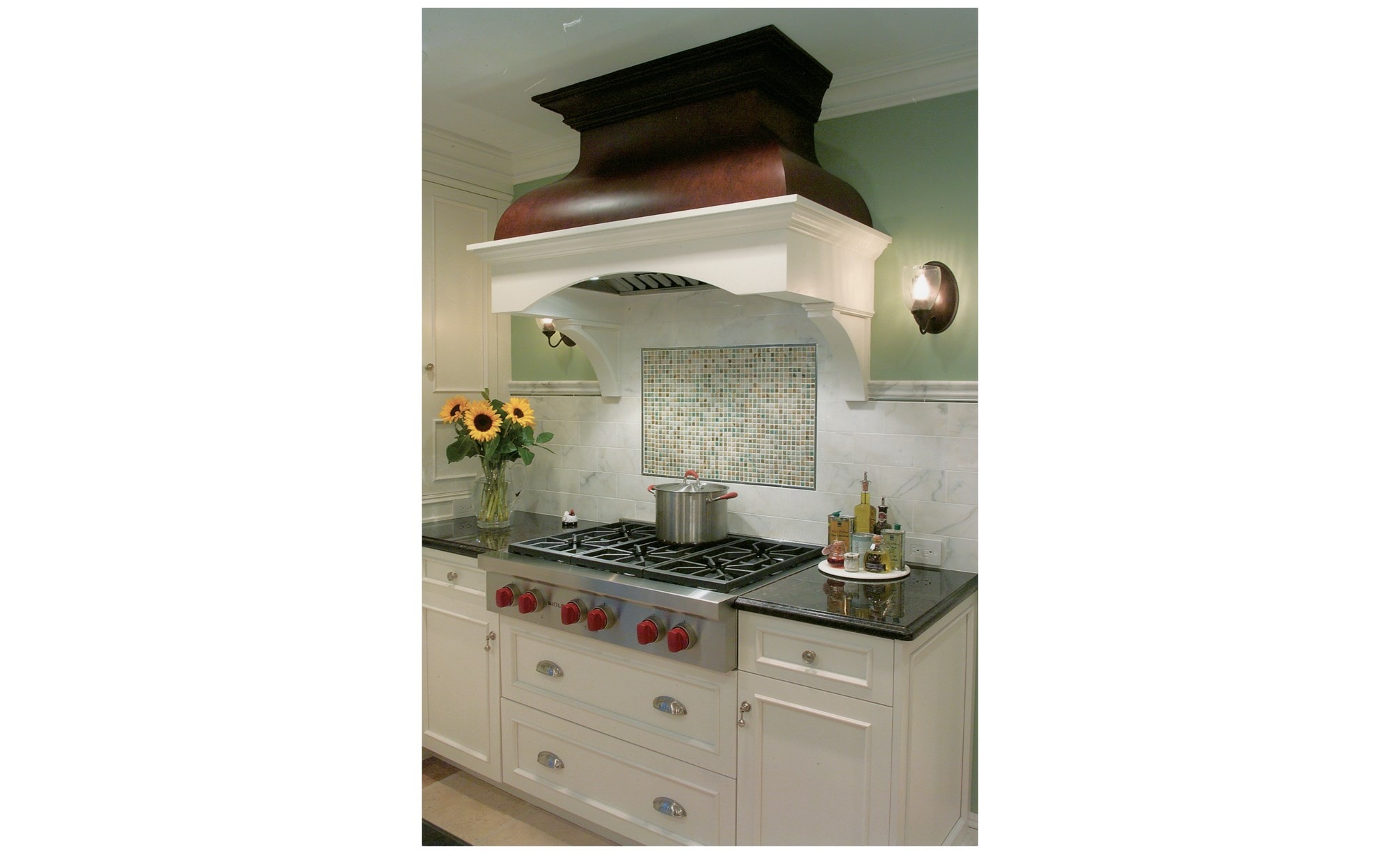 Ian Cairl of Platinum Designs took one look at the adjacent, underutilized sun room all alone in the corner and knew exactly what to do: remove the wall between the rooms to merge them and then marry them visually. Two generous islands now provide great workspace, and guests have multiple places to hang out while keeping the cook company. A custom bench and table overlooking the garden seats up to 10 when the leaves are in place: the perfect spot for homework, crafts, play dates, office work, games and puzzles. A Sub-Zero undercounter fridge near the table, hidden by matching cabinetry, keeps snacks and mealtime essentials nearby. To maintain the feeling of extensive space, walls on either side of the range hood were kept open. This highlights the Wolf 36-inch gas rangetop with sconce lighting and marble backsplash. Even the Wolf oven controls that slip away for a clean look add to the kitchen's new identity as a space for living. "They were putting value on time together and getting the most from their home," says Cairl. "It's not about budget or even about the footprint— it's about being creative in using that footprint. Don't think of spaces as separate. You can merge functions like play dates and entertaining for small and large parties. A place you feel happy and comfortable is really, really important. Regret is really expensive!