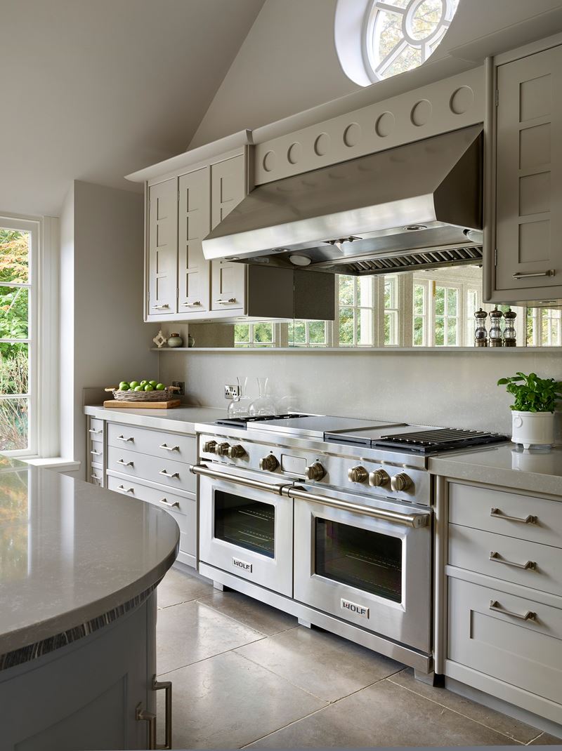 Martin creates handmade kitchens and furniture, produced by his own craftsmen, and even has 45 colors of Chiselwood paint manufactured just for his company. He was the ideal choice for a project like this: an early Victorian listed building that required respectful remodeling, and was subject to stringent building regulations. The first challenge was finding a new location for the kitchen. The existing one was in the front of the rectory, looking out onto the driveway. It was dominated by a large chimney, which limited what could be done in the room. In the rear of the rectory, however, there was a large conservatory that looked out on the extensive garden and beyond, to a picturesque valley. It was all glass – hot in the summer, cold in the winter – so it was not used often. Martin and his clients decided it would be an ideal location for the new kitchen, but that would require a roof, a new wall and efficient radiant heating. The clients also agreed to give up a home gym adjacent to the conservatory, which allowed for a scullery with a large pantry, crockery cupboard, and refrigerator and freezer combination unit so that the mess of dinner parties could be kept out of sight. Once the new kitchen location was determined, all changes had to be approved by planners, due to the historic listing of the property. Any changes to the outside were very strictly governed. The new solid wall at the far end, which houses a Wolf dual fuel range, had to be carefully ducted so the venting could not be seen on the exterior stone wall. The planners didn’t like the guttering on the new wall, so it had to be redone just weeks before the kitchen was completed.