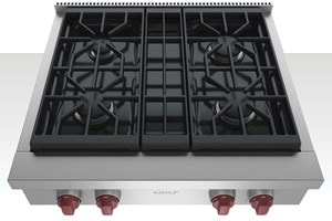 Wolf's gas rangetop delivers flexibility with dual-stacked, sealed burners and optional chargrill, teppanyaki, or wok burner. Front-facing knobs are available in red, black, brushed stainless, brushed brass, and brushed gray.