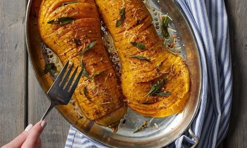 The Hasselback technique creates greater surface area for flavorful herbs, seasonings, and butter—and lots of it—to cling to. The result? Delicious flavor and texture in every bite. To achieve the hallmark thin slices of Hasselback dishes, we used a two-step roasting process. By roasting the unsliced squash halves until slightly softened, we were able to cut consistent, thin slits with ease.
