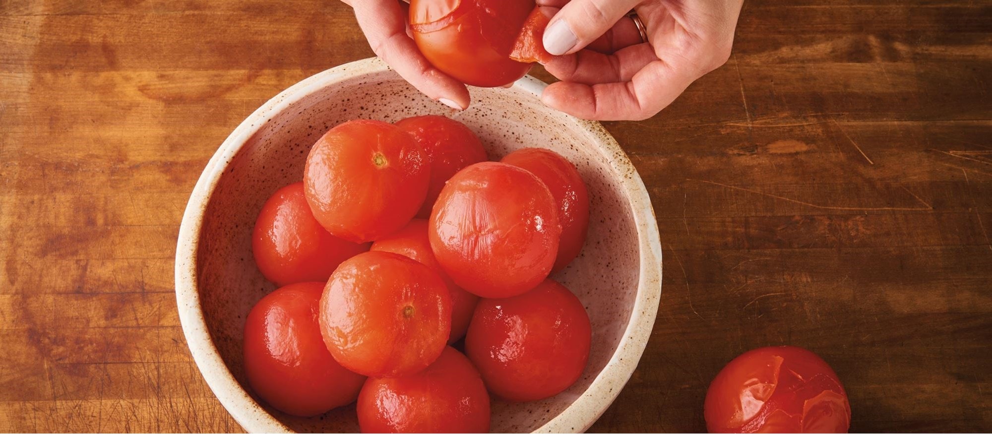 Often, to achieve the right texture for certain soups or sauces, you’ll need tomatoes without skins. Here’s a simple way to peel fresh, ripe tomatoes.